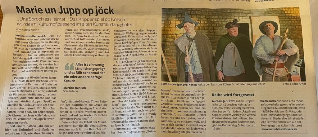 Am 4. Advent wurde der Kulturhof Velbrück zum Treffpunkt für kölsche Mundart, Musik und gemeinsames Singen. Bei dem bereits im Vorfeld lange ausverkauften Adventsabend stimmte Wolfgang Jaegers mit dem Publikum und seiner Quetsch kölsche Weihnachtslieder an, bevor der Mundartspielkreis St. Kilian aus Lechenich mit dem Krippespill „De Chreessnach en Kölle“ für berührende und heitere Momente sorgte. Glühwein, Kekse und die große Krippe im alten Pferdestall rundeten den Abend ab und machten ihn zu einem rundum gelungenen, wohlig-warmen Jahresabschluss.